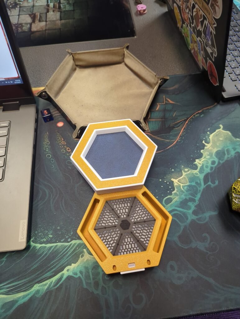 This two-part case uses an inner silicone layer to compress up to a full set of dice (+ a few extra) keeping them nice and quiet. Equipped with 2 satisfying haptic release switches, opening this case is like discovering a treasure untold. Once opened, that same silicone that secured your dice inside transforms into a launch zone for your dice to bounce off of.Â